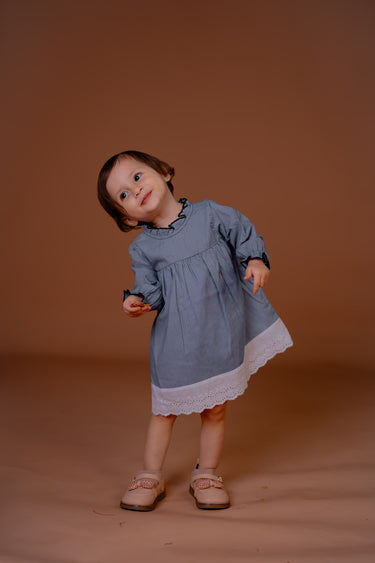 Dress your little girl in timeless elegance with this blue long sleeve baby dress. Featuring a dainty ruffle neckline, gathered waist, and a white lace hem, this outfit is designed for both comfort and style. The soft cotton fabric ensures breathability, making it perfect...- Rs. 749.00