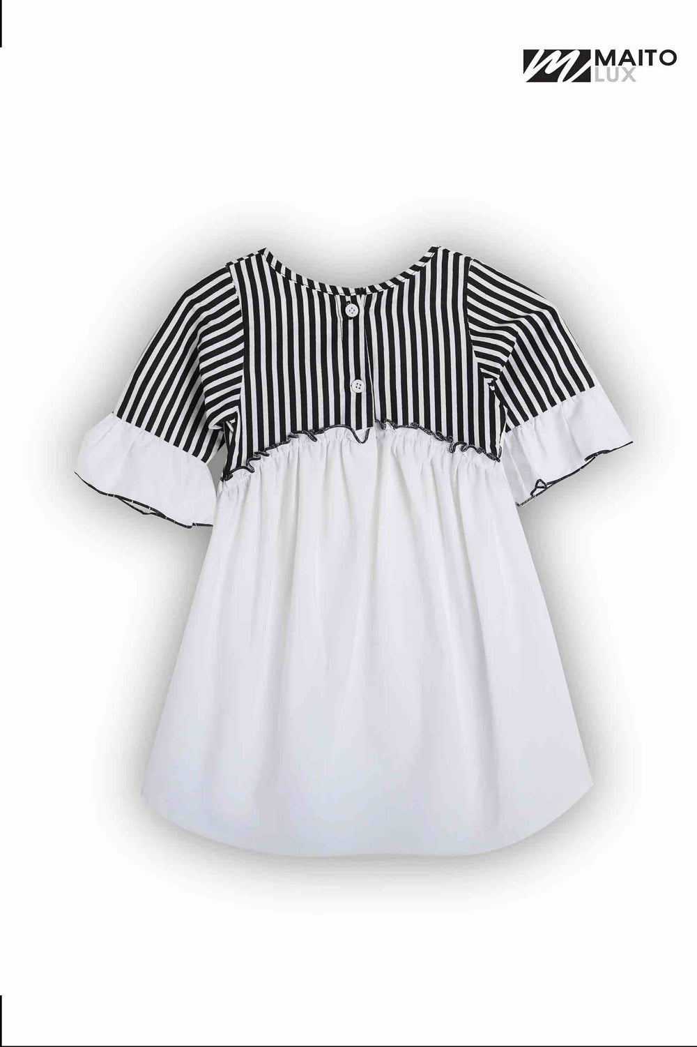 Let your little one shine in the Chic Contrast Striped Ruffle Dress, a perfect blend of modern elegance and playful charm. This beautifully designed dress features a black-and-white striped bodice that adds a touch of sophistication, while the flowy white lower half creates a soft and dreamy silhouette.