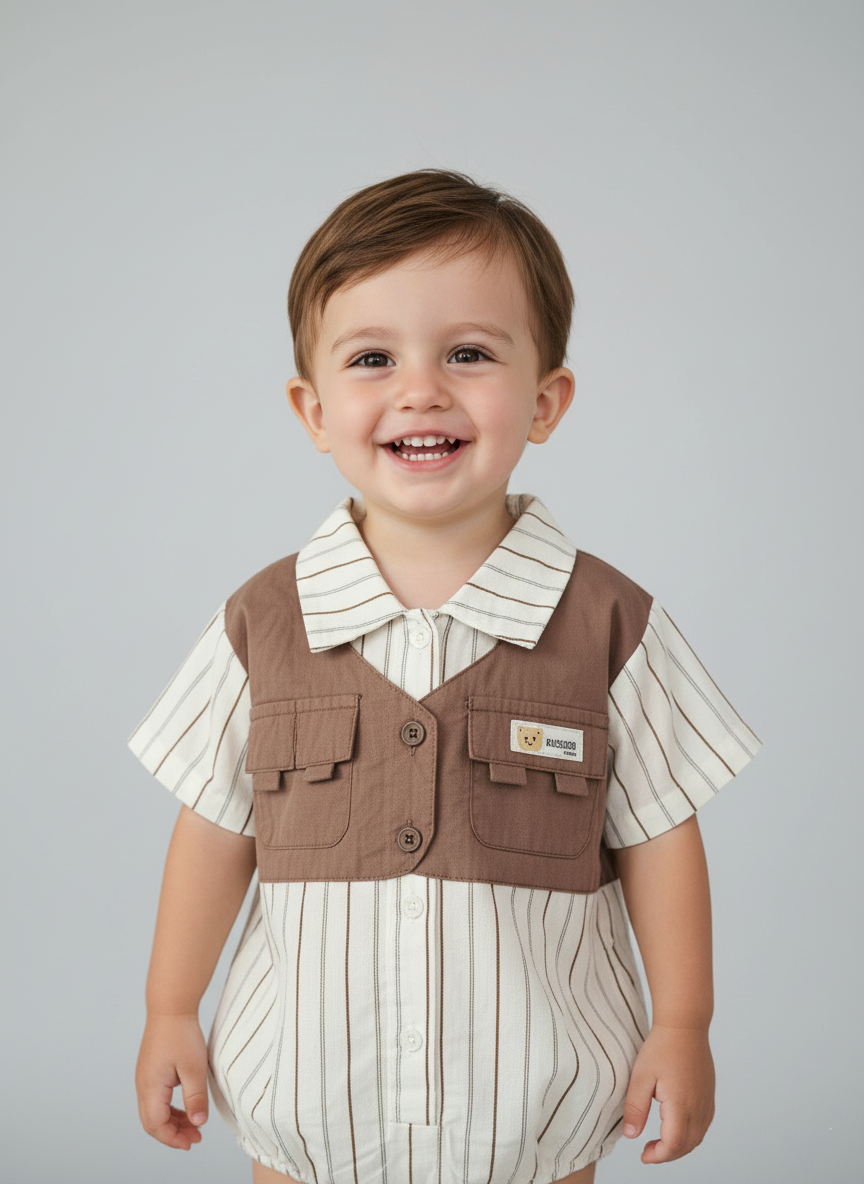 Set off on everyday adventures with the Little Adventurer Safari Romper! This charming one-piece combines a soft cream-and-brown striped base with a safari-style chest design featuring functional flap pockets and a collared neckline for a classic explorer look. Crafted from breathable cotton, it ensures comfort and ease of movement for your little one. Perfect for playdates, outdoor fun, or casual outings, this romper brings playful explorer vibes to your baby’s wardrobe.