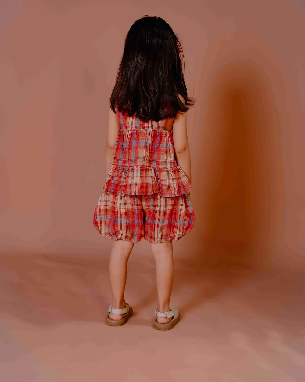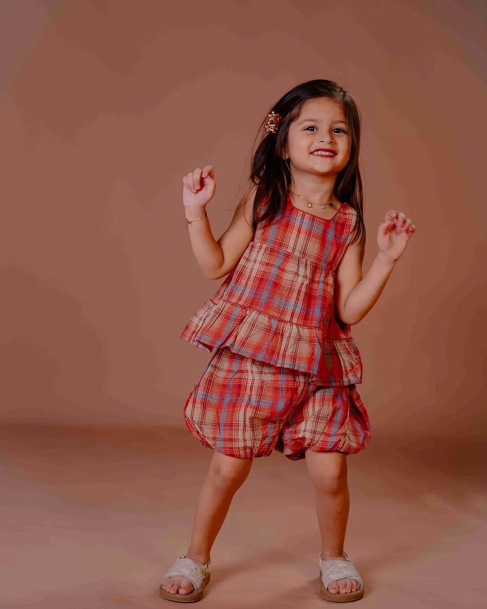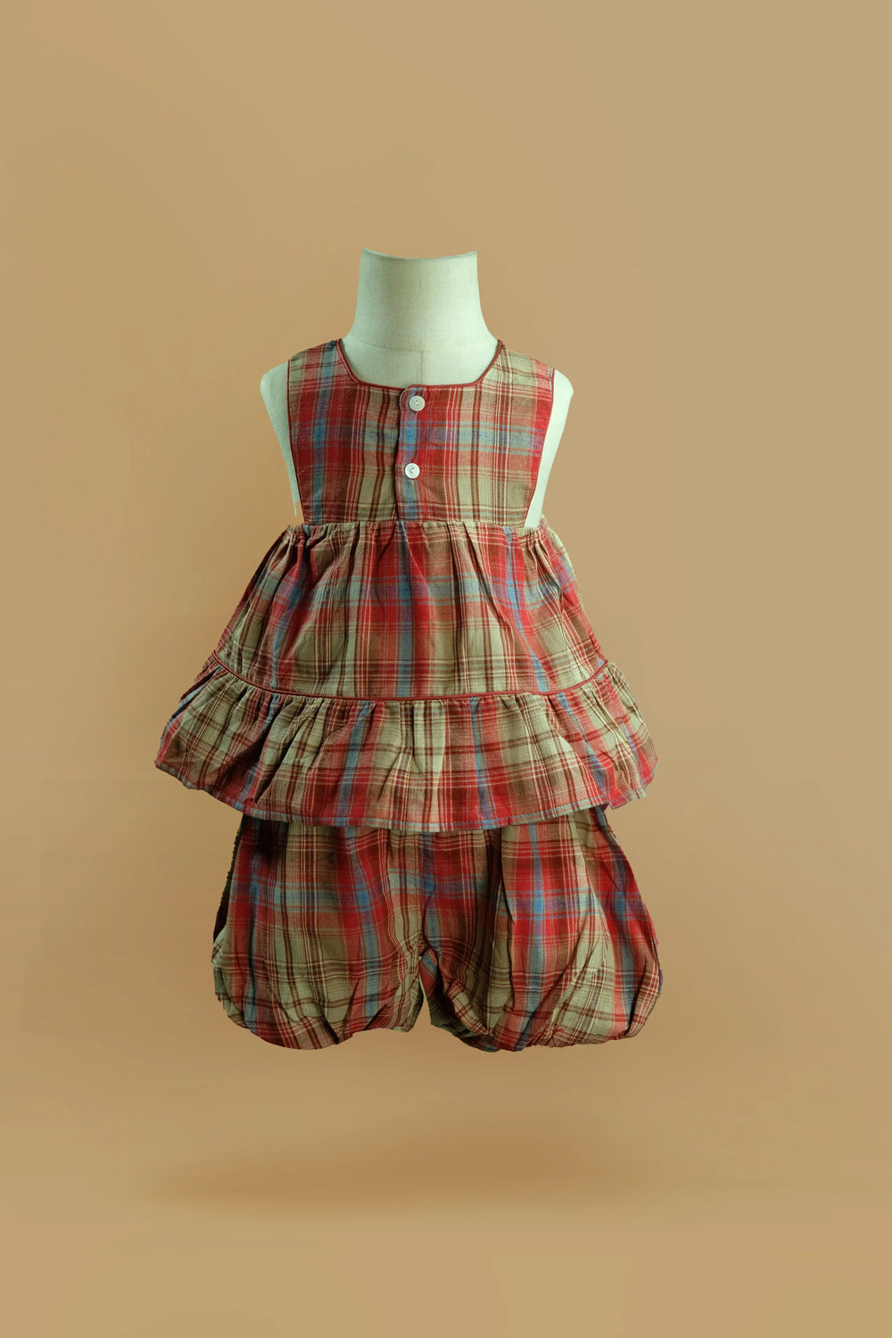 Elevate your child's wardrobe with the timeless and cozy Rustic Charm Plaid Set. Featuring a tiered peplum top with delicate red piping and bubble-style shorts with an elastic waistband, this two-piece ensemble exudes elegance and comfort. The vintage-inspired plaid pattern adds a playful touch, making it perfect for any occasion.