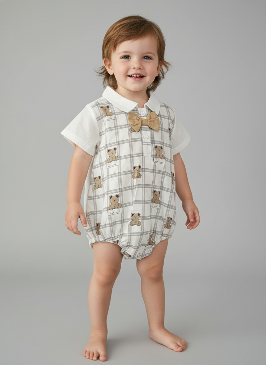 Sweetness meets sophistication in the Teddy Charm Bow Romper! Designed with a soft plaid pattern and adorable teddy bear prints, this romper adds a touch of playful charm to your little one’s wardrobe. The beige bow tie and crisp white collar bring a classic, dressed-up look, perfect for special occasions or photo days. Crafted from lightweight, breathable cotton, it ensures all-day comfort and easy movement for your baby boy. A stylish blend of cozy and cute!
